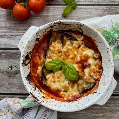 In eine Form schichten: Sauce – Auberginen – Mozzarella – Parmigiano. Mehrmals wiederholen, mit Sauce & Parmigiano abschließen.